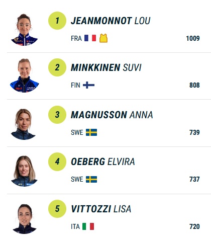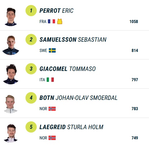 Na prvním místě se suverénně nachází Eric Perrot z Francie s 1058 body. Druhou příčku drží Sebastian Samuelsson ze Švédska, který má na kontě 814 bodů. Třetí je Ital Tommaso Giacomel se ziskem 797 bodů. Na čtvrtém místě figuruje Nor Johan-Olav Smørdal Botn s 783 body a první pětici uzavírá další norský závodník Sturla Holm Lægreid, který má 749 bodů.