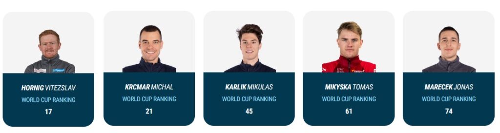 Vítězslav Hornig se nachází na 17. místě ve Světovém poháru. Michal Krčmář je aktuálně na 21. příčce. Třetí zleva je Mikuláš Karlík, který figuruje na 45. místě. Dále následuje Tomáš Mikyska na 61. pozici a pětici uzavírá Jonáš Mareček, který se nachází na 74. místě světového žebříčku.