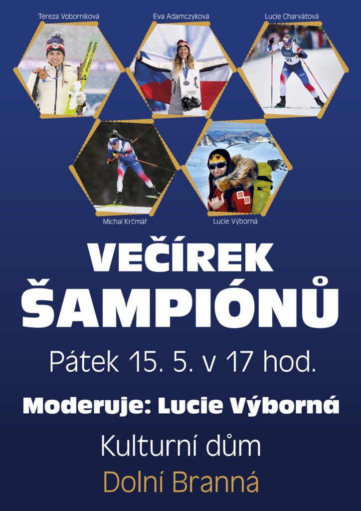 Obec Dolní Branná pořádá Večírek šampionů, kterou bude moderovat Lucie Výborná. Hosty večera budou biatlonisté Tereza Voborníková, Lucie Charvátová, Michal Krčmář a snowboardistka Eva Adamczyková.
