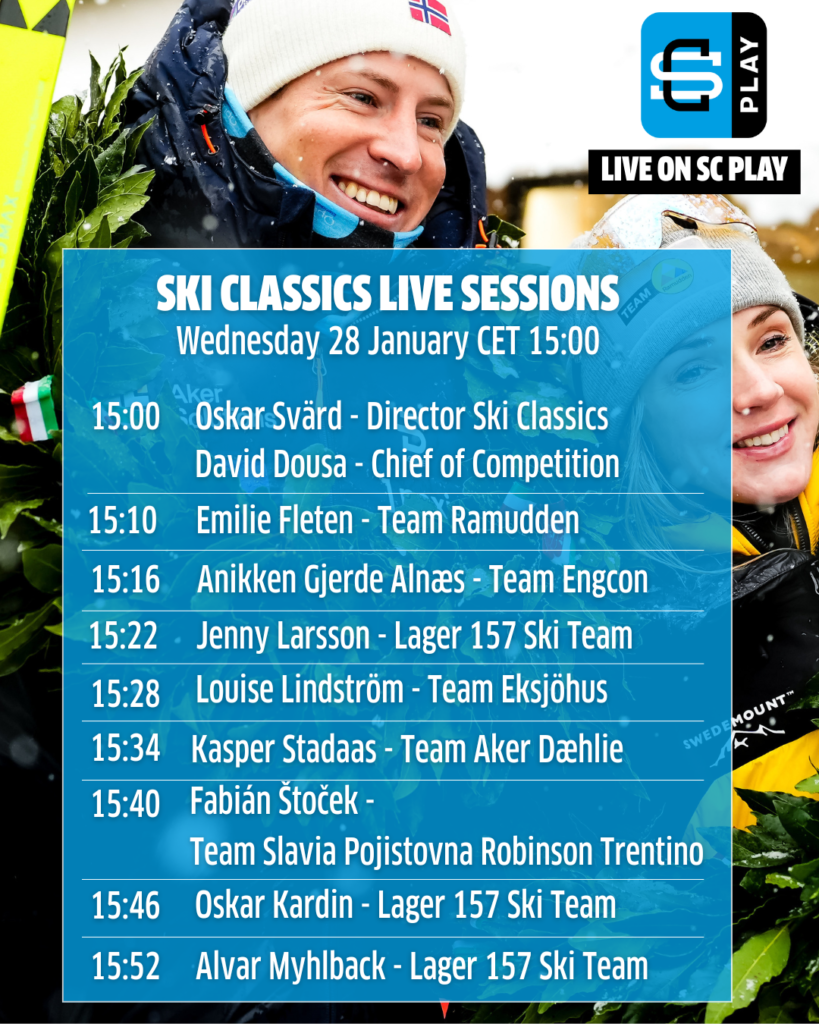 Ski Classics Live Sessions je formát živě streamované tiskové konference, kde se novináři, fanoušci, sponzoři a členové komunity mohou setkat s nejlepšími sportovci a klíčovými osobnostmi před každým víkendem Pro Tour. Stream je k dispozici živě a na vyžádání pro celou komunitu Ski Classics.