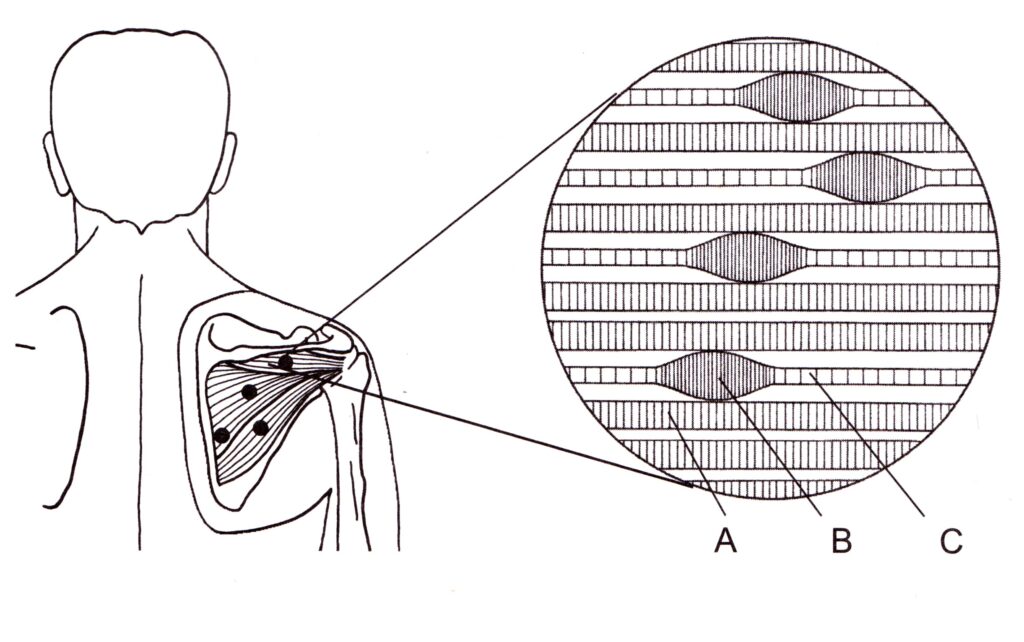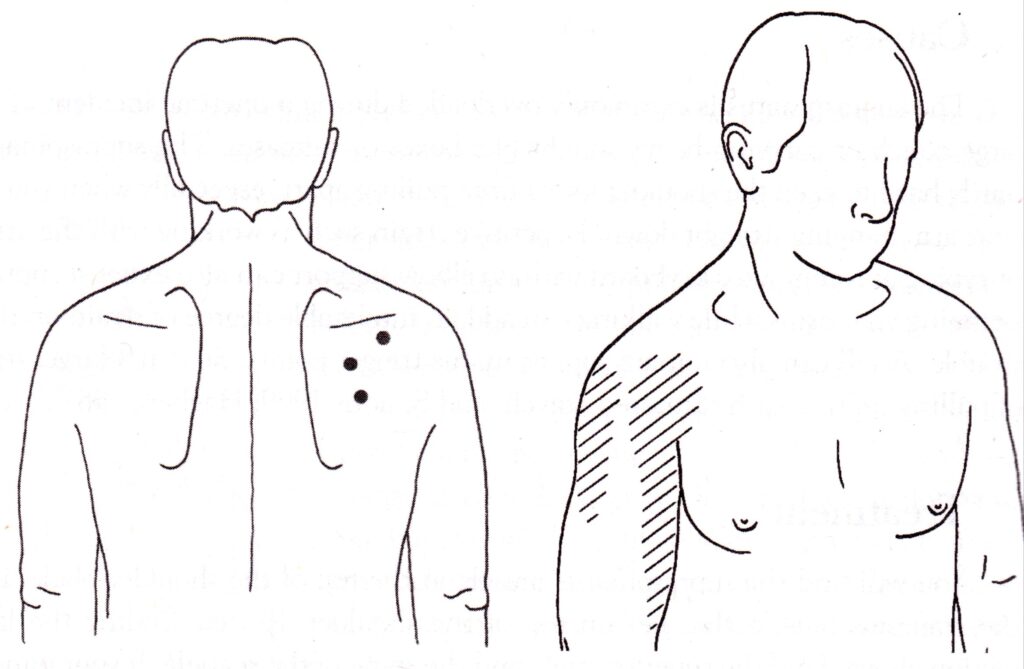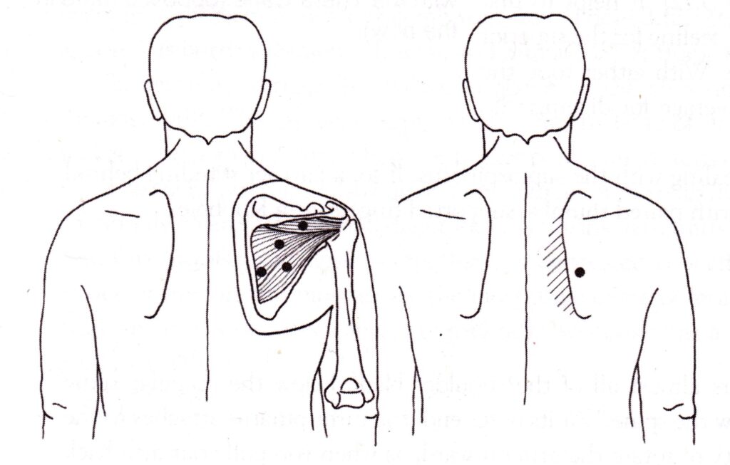 Pro určitou představu uvádíme spouštěcí body typické pro podhřebenový sval (m. infraspinatus), který je mimojiné významný stabilizátor ramenního kloubu v okamžiku zapojení ostatních rotátorů manžety. Spouštěcí body tohoto svalu přenášejí bolest do přední části ramene a bicepsu a za lopatku. Mohou tedy významně limitovat funkčnost ramene.