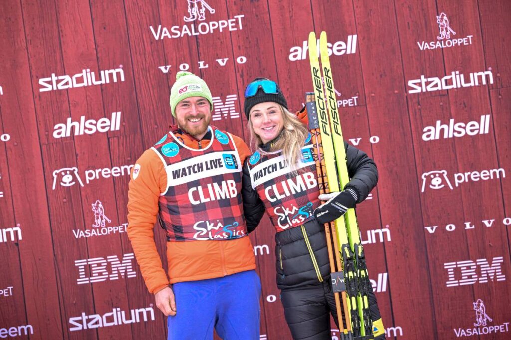 Thomas Bing a Emilie Fletenová v cíli Vasova běhu s vrchařskými dresy © Reichert/NordicFocus